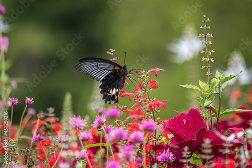 © Bogey Yamamoto, Fototapeta premium 群生するチェリーセージには黒いアゲハチョウたちが集まってきます。アゲハチョウたちの自然の楽園。
