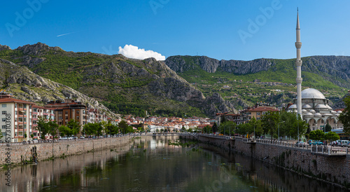 © pespiero, Fototapeta premium トルコ アマスィヤに流れるイェシル川と川沿いの街並みとファティ・スルタン・メフメットモスク