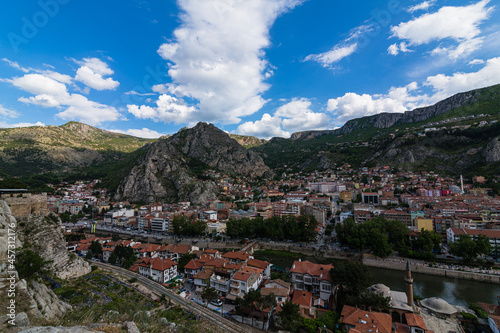 © pespiero, Obraz premium トルコ アマスィヤのポントス王の墓の丘から望む旧市街と新市街の街並みとイェシル川