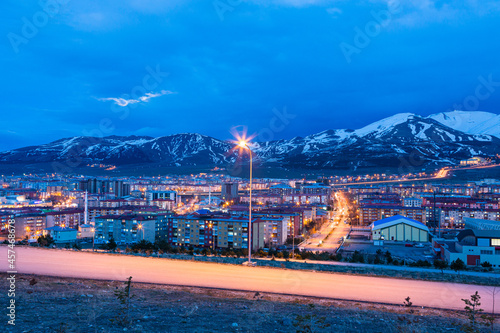 Obraz premium トルコ エルズルムの丘から見える夜景と雪の積もったパランドケン山