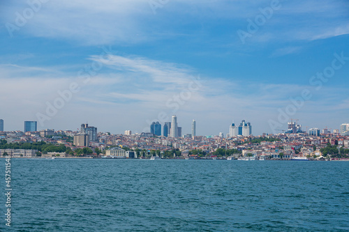 Obraz premium トルコ イスタンブールのボスポラス海峡を進むフェリーから見えるヨーロッパ側の街並み