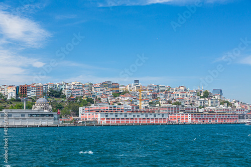Obraz premium トルコ イスタンブールの金角湾を進むフェリーから見える新市街の街並み