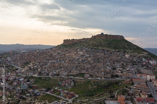 Obraz premium トルコ 丘から見える山の斜面に広がるマルディンの旧市街の街並みと山頂に立つマルディン城と夕焼け空