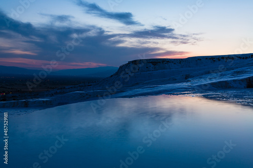Obraz premium トルコ 夕暮れ時のヒエラポリス・パムッカレの石灰棚と青い水面
