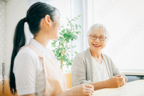 © buritora, Obraz premium 笑顔の高齢者女性と女性スタッフ