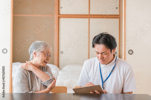 Fototapeta premium 在宅介護を受ける高齢者女性(肩こり)