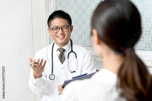 Fototapeta premium 問診をする白衣を着た笑顔の若い男性医師(医療従事者・ドクター)