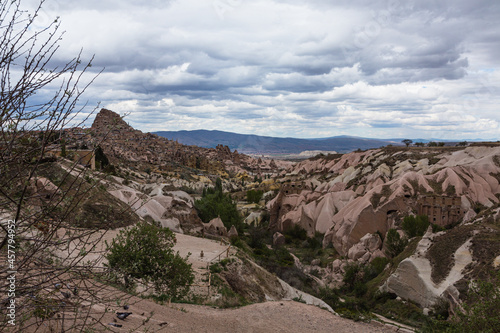 Fototapeta premium トルコ カッパドキアのウチヒサール城と鳩の谷の奇岩群と洞窟住居
