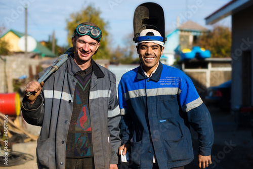 Fototapeta premium счастливые рабочие сварщик и сантехник