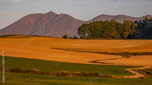 Obraz premium 夕陽に照らされる畑と十勝連峰 北海道