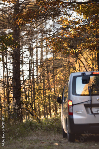 © Hekaton.C, Obraz premium 輝く秋の森の中をキャンプに向かう車