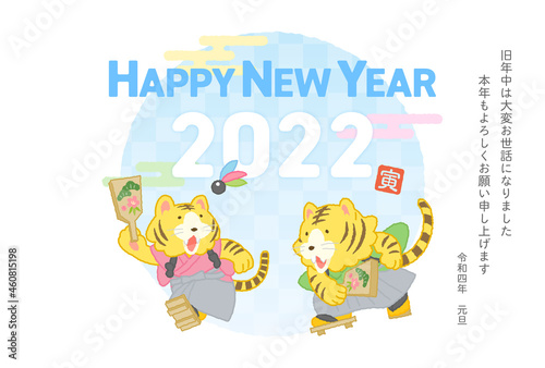 © 鳥屋野, Obraz premium 2022年年賀状テンプレート(横) 羽根つきをする虎のイラスト
