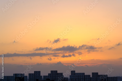 Fototapeta premium 都市の夜明け、早朝ビルの隙間から太陽が昇り辺りはオレンジ色に染まる。ビルはシルエットに浮かぶ