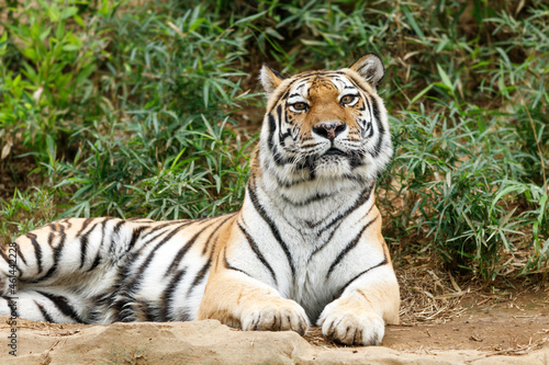 © maruboland, Naklejka premium トラ、植え込みを背景に座って辺りを見渡す