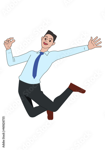 Fototapeta premium 男性のビジネス姿の笑顔で楽しく飛んで飛躍しているアクティブな全身像