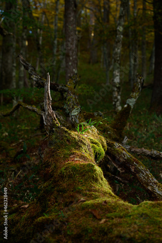 © Ichiro, Obraz premium 森の中で朽ちた苔生す倒木に芽吹く新しい葉(縦写真)