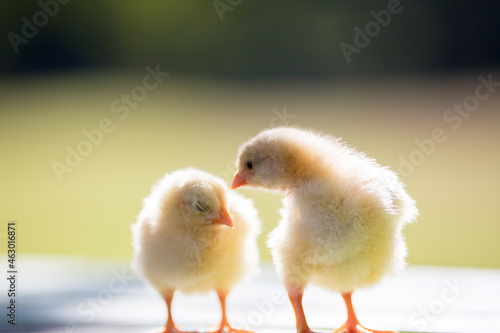 © zheng qiang, Fototapeta premium 夏の公園のベンチで遊んでいる可愛いヒヨコの姿