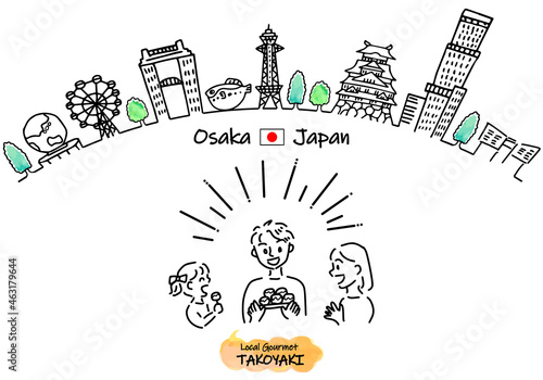 Obraz premium 大阪の観光地街並みと家族とご当地グルメのシンプル線画セット