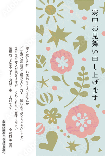 © Chimichanga, Fototapeta premium 寒中お見舞いハガキテンプレート/版画調/植物モチーフ/挨拶文