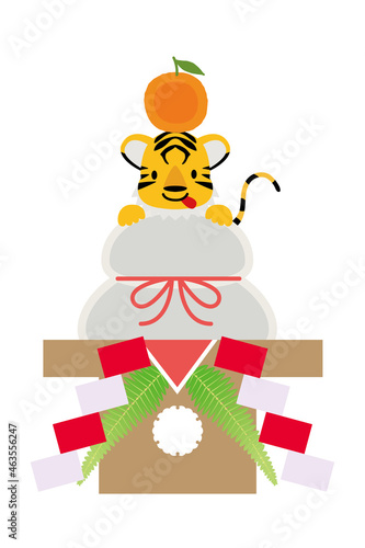 Naklejka premium 年賀状素材 寅年|鏡餅と可愛い虎トラのイラスト 漫画 正月イメージ アイコン