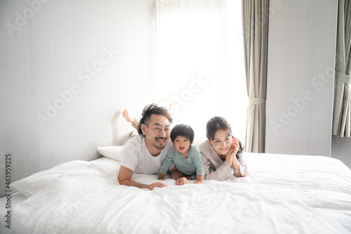 © kapinon, Fototapeta premium 新築の様な白くて広い寝室で美人なママと赤ちゃんとパパの寝転がる家族のポートレート1 コピースペースあり