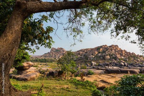 © pespiero, Obraz premium インド ハンピのトゥンガバドラ川沿いの風景と岩山