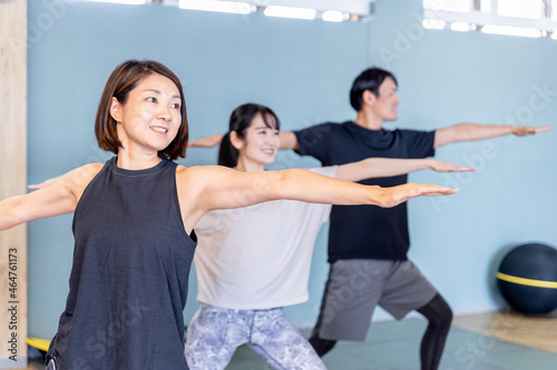 © buritora, Naklejka premium スポーツジムでヨガをする男女(戦士のポーズ)