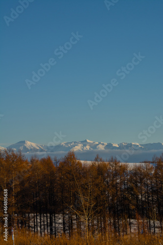 © kinpouge, Fototapeta premium 晩秋のカラマツ林と山並み 十勝岳