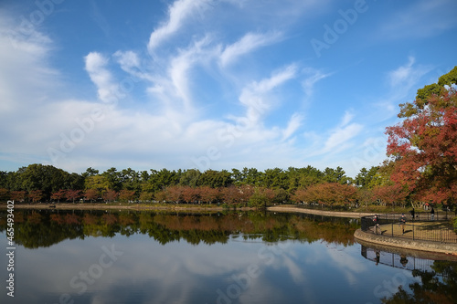 © FUJIOKA Yasunari, Fototapeta premium 桜並木のリフレクションが綺麗な池の背後に、煙が上っているように見える雲が浮かんでいる公園の風景
