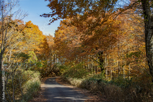 Obraz premium 兵庫県・新温泉町の上山高原から鳥取県境の紅葉する林道をハイキング、ドライブ、ツーリング