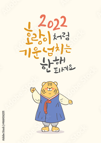 Obraz premium 2022 호랑이해 캘리그라피 연하장. 손을 흔드는 한복입은 호랑이 캐릭터.