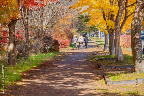 © tatsushi, Naklejka premium 紅葉の季節に軽井沢で自転車に乗る親子