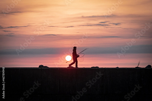 © TAKACHA CAMERA, Fototapeta premium 朝日に照らされる釣り人