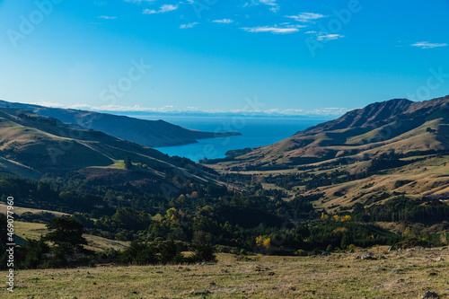© pespiero, Fototapeta premium ニュージーランド 南島の町、アカロア郊外の丘から望むバンクス半島の風景