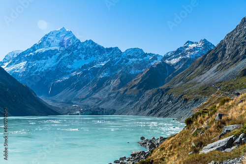 © pespiero, Obraz premium ニュージーランド アオラキ・マウント・クック国立公園のフッカー・バレー・トラックのトレッキングコースのゴール地点、フッカー氷河湖から見えるアオラキ山
