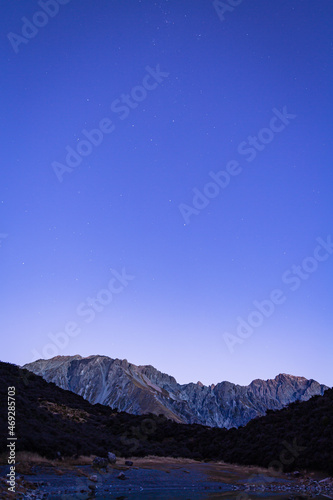© pespiero, Obraz premium ニュージーランド アオラキ/マウント・クック国立公園内にあるタスマン氷河湖の脇にあるブルー湖から見える南アルプス山脈のザ・ナンズ・ベイルと星空