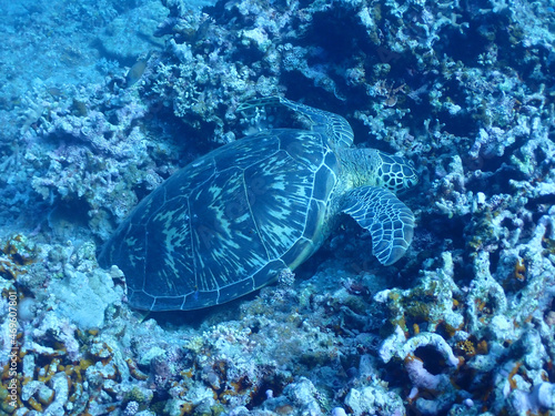 Obraz premium 沖縄・石垣島の海底でくつろぐウミガメ
