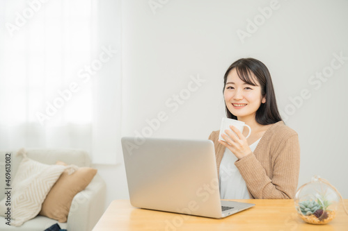 Fototapeta premium 家でノートパソコンを使う女性(飲み物)