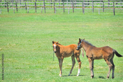 Fototapeta premium 牧場で遊ぶ美しいサラブレッドの仔馬