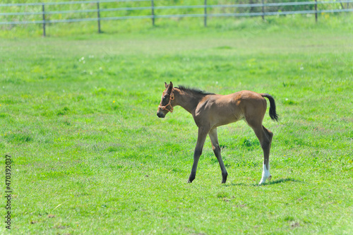 Fototapeta premium 牧場で遊ぶ美しいサラブレッドの仔馬