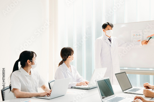 Fototapeta premium 会議する白衣姿の男女(マスク)