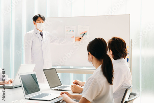 © buritora, Obraz premium 会議する白衣姿の男女(マスク)