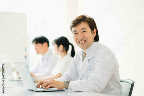 Obraz premium 白衣を着た男性(パソコン・笑顔)