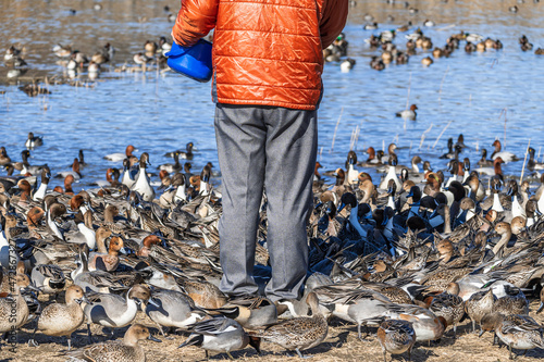 © kikisora, Obraz premium 餌をあげる人に群がるカモ