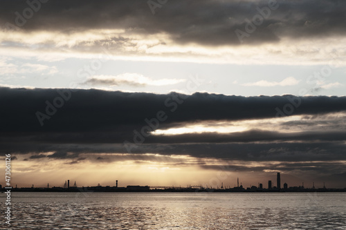 Obraz premium 兵庫県芦屋市芦屋浜の夜明け。日の出とともに あたりはオレンジ色に染まる。大阪湾を隔てて大阪市街地のビルがシルエットで浮かぶ