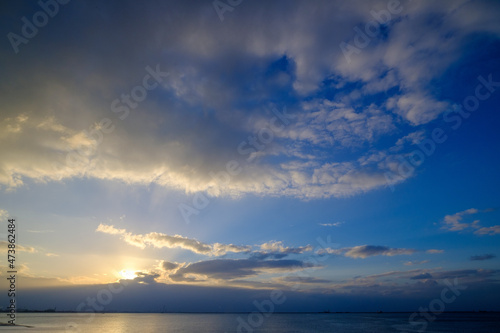 Naklejka premium 兵庫県芦屋市芦屋浜の夜明け。雲に覆われていて太陽が雲の間から顔を出し、天使の梯子が海に落ちる