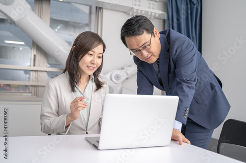 Obraz premium オフィスでノートパソコンを見ながら打ち合わせをする男女のビジネスマン