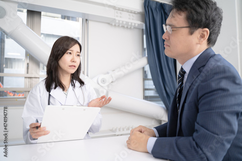 Fototapeta premium 病状をカウンセリングする女医と悩む男性患者メディカルイメージ