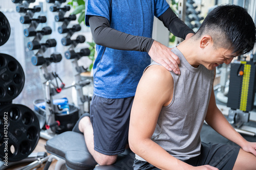Obraz premium アスリートをジムやリハビリで調整するトレーナー コピースペースあり