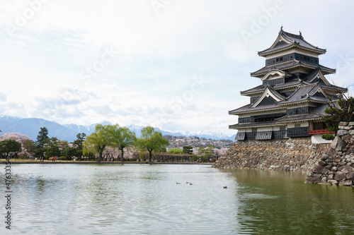 © apiox, Fototapeta premium 長野県松本市街地に建つ、青空の下の満開の桜と松本城の天守閣